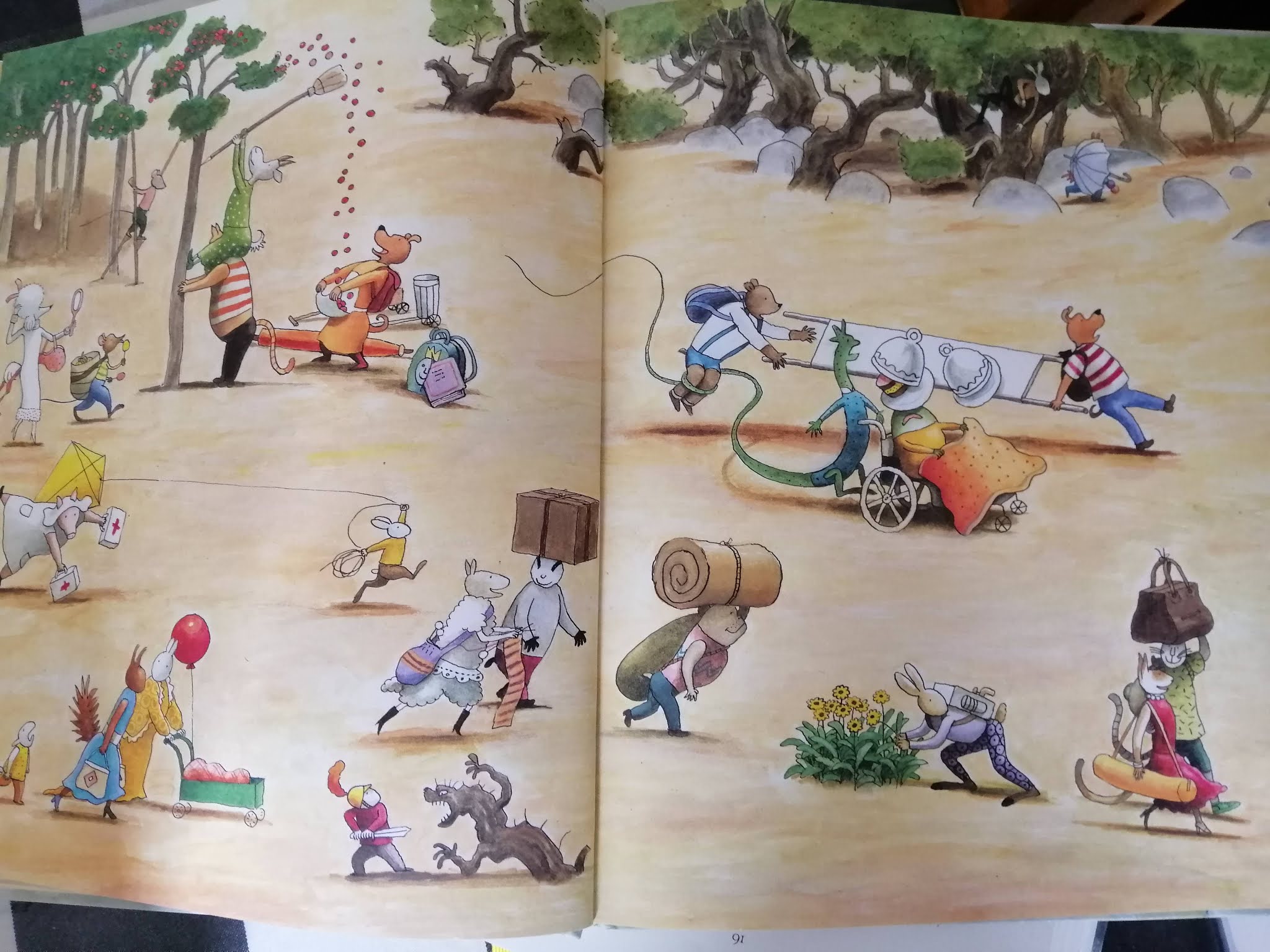 This Picknick book has no story written inside, just pictures from beginning to end, and we have to tell our own story based on the pictures, and together with the children we observed all the characters and what happened to each of them.